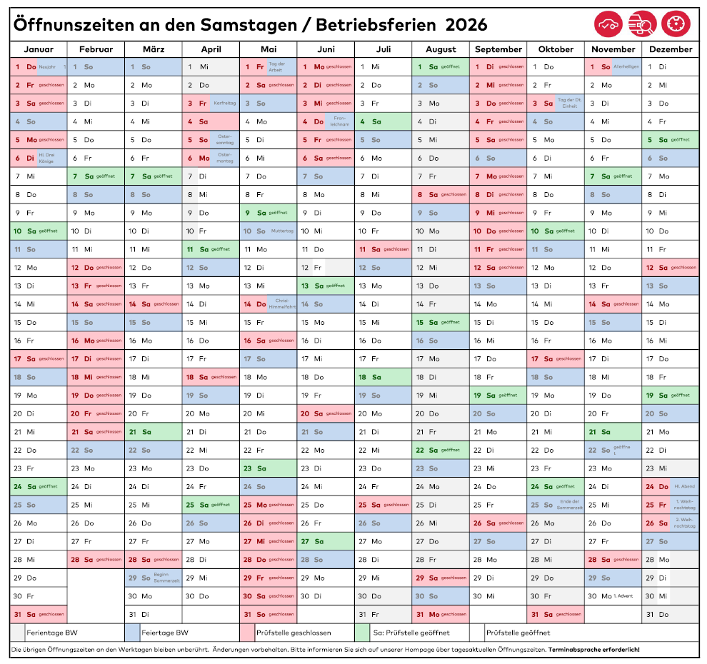 hier finden Sie die Öffnungszeiten für die Samstage in 2026. Des Weiteren finden Sie auch die Brückentage und die Tage der Betriebsferien an denen die Prüfstelle geschlossen ist.